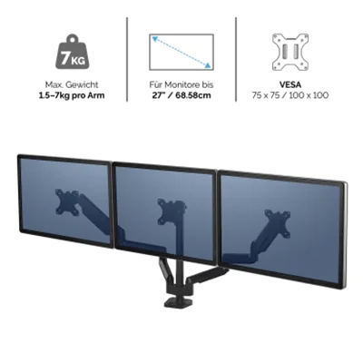 Beschreibung | Fellowes Platinum Series Triple Arm - Befestigungskit für 3 Monitore (einstellbarer Arm) Aluminium - Schwarz - Bildschirmgröße: bis zu 68,6 cm (bis zu 27 Zoll) - Tischmontage | |||