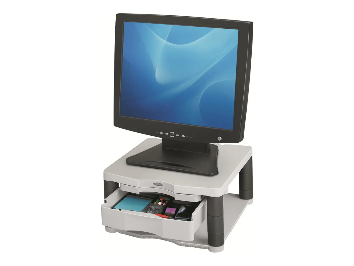 Geeignet für herkömmliche oder Flachbildschirme. Der durch FIRA zertifizierte Ständer bringt den Bildschirm auf eine angenehme Sichthöhe und ermöglicht zudem eine bessere Organisation des Arbeitsplatzes. In 5 Stufen höhenverstellbar.