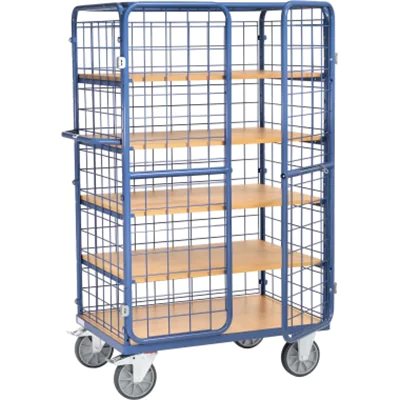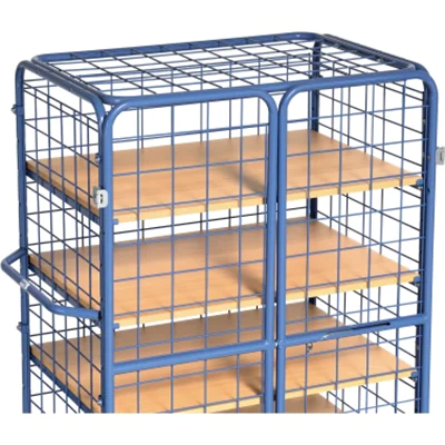 Baukasten-System, Stahlrohr und Profilstahl geschweißt, pulverbeschichtet blau RAL 5007, Schraubkonstruktion. Stirnwände und eine Längswand geschlossen mit Drahtgitter 100 x 100 x 5 mm. Mit einer Doppel-Flügeltür, Stahlrohrrahmen mit eingeschweißtem Drahtgitter 100 x 100 x 5 mm. In den Rohrrahmen integrierter Riegelverschluss, abschließbar durch Vorhängeschloss (nicht im Lieferumfang enthalten), Türflügel an die Stirnwände klappbar. Mit Dach aus Drahtgitter. 1 fester und 4 lose Einlegeböden Oberfläche aus Buchendekor. Einlegeböden variabel einsetzbar, Teilung 100 mm. 2 Lenk und 2 Bockrollen. Naben mit Rillenkugellager.