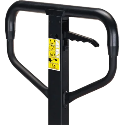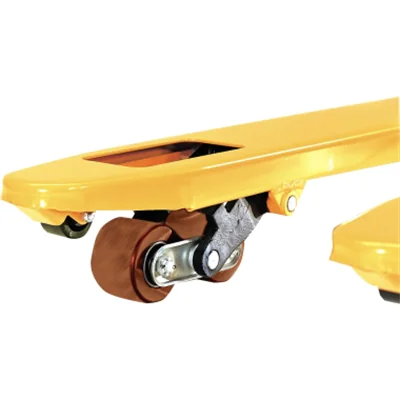 Rahmen und Gabeln in verwindungsfreier Schalenbauweise, gelb pulverbeschichtet. Hydraulische Handpumpe wartungsfrei gelagert. Stabile Stahlrohrdeichsel mit Gegenlager für Schubbetrieb, pulverbeschichtet schwarz, Griff gummiummantelt. Bedienhebel für die Funktionen: Heben - Fahren - Senken. Lenkeinschlag 2 x 100°. Kletterrollen an den Gabelspitzen. Beräderung: Geringer Rollwiderstand, elastischer Lauf. Gut auf empfindlichen Böden, nicht kreidend = spurlos. Geringe Fahrgeräusche. Lenkräder: 20 x 5 cm (Ø x B). Gabelrolle: 8 x 7 cm (Ø x B).