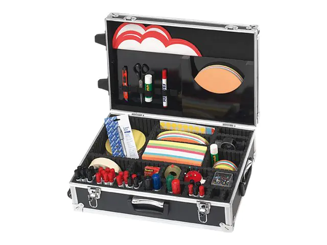 Inhalt: 500 Rechtecke 9,5 x 20,5 cm, 250 Kreise Ø 9,5 cm, 250 Kreise Ø 14 cm, 250 Kreise Ø 19,5 cm, 250 Ovale 11 x 19 cm, 250 Rhombus 9,5 x 20,5 cm, 20 Moderationswolken 25 x 42 cm, 8 Jumbo Marker (2 x schwarz, 2 x rot, 2 x blau, 2 x grün), je 15 Flipchart Marker (schwarz, rot), je 520 Stück Markierungspunkte (rot, grün), 1 Kreppband, 1 Klebefilmabroller, 2 Klebestifte, 300 Pinnnadeln (Rundkopf), 1 Nadelkissen, 1 Schere, 1 Cutter, 1 Laserpointer mit rotem Lichtstrahl und integriertem Kugelschreiber.