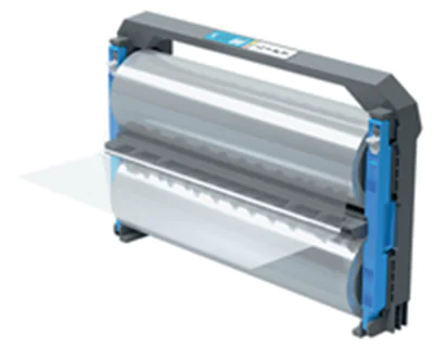 Nachfüllbare Folienkassette. Einfach die leere Kassette herausnehmen, Kassettenhebel öffnen, eine Ersatzrolle einsetzen und Hebel schließen. Die komplette Kassette wird dann ganz einfach wieder in das Laminiergerät eingelegt.