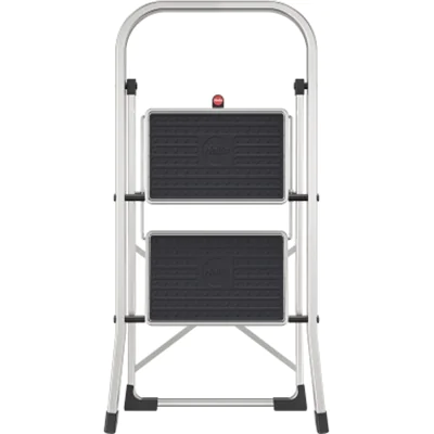 Hailo K60 StandardLine. Die leichte, flache Trittleiter mit den großen Stahl-Stufen Anti-Rutsch-Matten (schwarz). Mit Klappsicherung (Sicherheitsverriegelung). Griffgünstiger Vierkantrohr-Bügel. Aluminium-Holme. Standsicherheit durch ganzflächig aufstehenden, rutschsicheren Steckfuß. Zusammengeklappt nur 5 cm schmal.