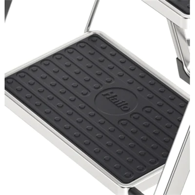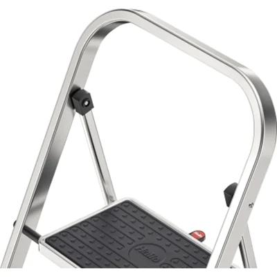 Hailo K60 StandardLine. Die leichte, flache Trittleiter mit den großen Stahl-Stufen Anti-Rutsch-Matten (schwarz). Mit Klappsicherung (Sicherheitsverriegelung). Griffgünstiger Vierkantrohr-Bügel. Aluminium-Holme. Standsicherheit durch ganzflächig aufstehenden, rutschsicheren Steckfuß. Zusammengeklappt nur 5 cm schmal.