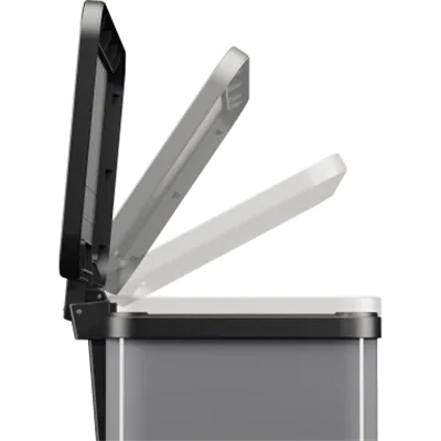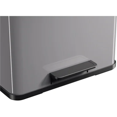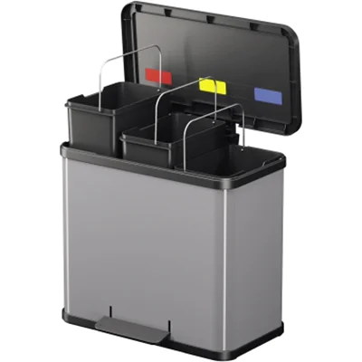 Der Tret-Mülltrenner mit drei einzeln entnehmbaren Inneneimern. Gedämpfter Deckel-Schließ-Mechanismus (Soft close). Ergonomisch breites Fußpedal aus Kunststoff. Innenliegende Tretmechanik. Inkl. Farbsticker zur Müllsorten-Kennzeichnung.