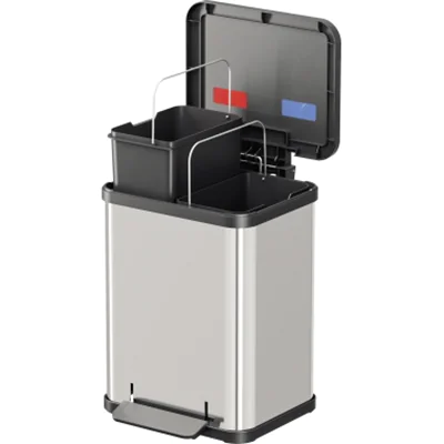 Der Tret-Mülltrenner mit doppeltem Einsatz für die 2-fach-Mülltrennung. Gedämpfter Deckel-Schließ-Mechanismus (Soft Close). 2 herausnehmbare Inneneimer. Ergonomisch breites Fußpedal aus Kunststoff. Innenliegende Tretmechanik. Inkl. Farbsticker zur Müllsorten-Kennzeichnung.