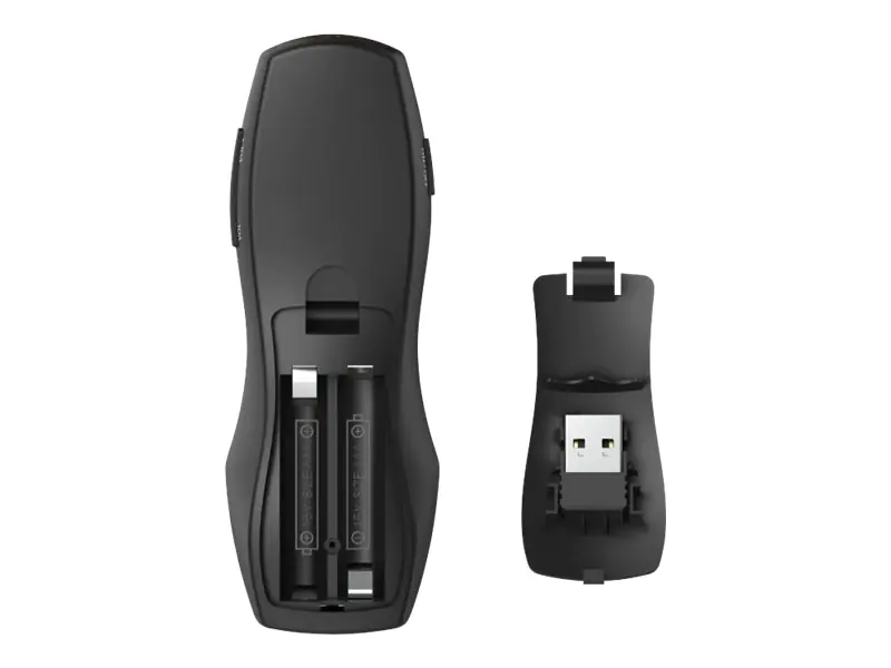 - Air-Maus-Funktion: macht den Presenter zur kabellosen PC-Maus und erlaubt Befehle mit der rechten und linken Maustaste, sowie die Steuerung des Mauszeigers