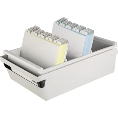 Besonderheiten: das Unterteil kann platzsparend in den abnehmbaren Deckel gestellt werden, optimales Beschriftungsfeld, möbelschonende Kautschukfüßchen, verschiebbare Sichtreiter.