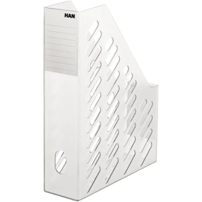 Klassisch und stilvoll in transluzenter Optik. Nichts kippt mehr, nichts liegt herum, alles ist schön sortiert. Extra hohe Vorderseite um Dokumente sicher zu halten. Mit seitlichem Raster, dass Einsicht auf Kataloge, Prospekte, Zeitschriften, etc. erlaubt. Das Rückenschild kann an der Vorder- oder Rückseite befestigt werden. Gratis Druckvorlagen finden Sie auf www.han-online.com.