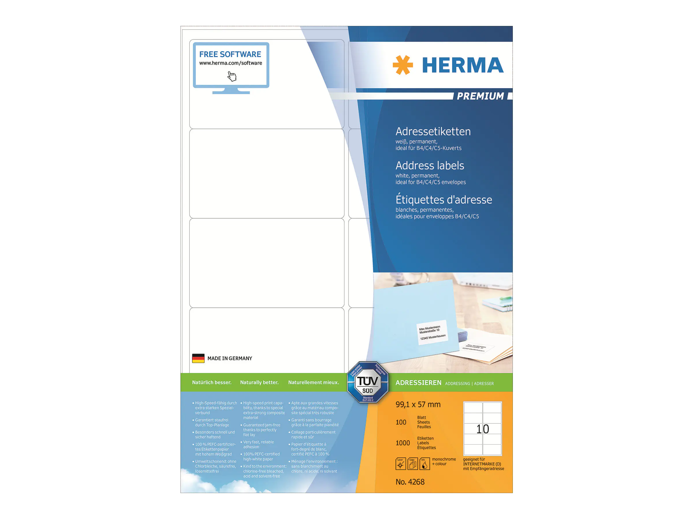 - Premium Adressetiketten auf A4-Blättern, schnell und sicher permanent haftend