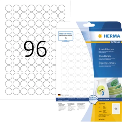 HERMA Special - Papier - matt - selbstklebend, entfernbarer Klebstoff - weiß - 20 mm rund 2400 Etikett(en) (25 Bogen x 96) | ||||