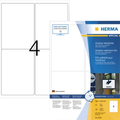 HERMA 9539. Produktfarbe: Weiß, Form: Rechteck, Format: A4. Bogenbreite: 9,91 cm, Bogenlänge: 13,9 cm. Aufkleber pro Satz: 160 Stück(e), Haftetiketten pro Blatt: 4 Stück(e), Medienanzahl pro Paket: 40 Blätter
