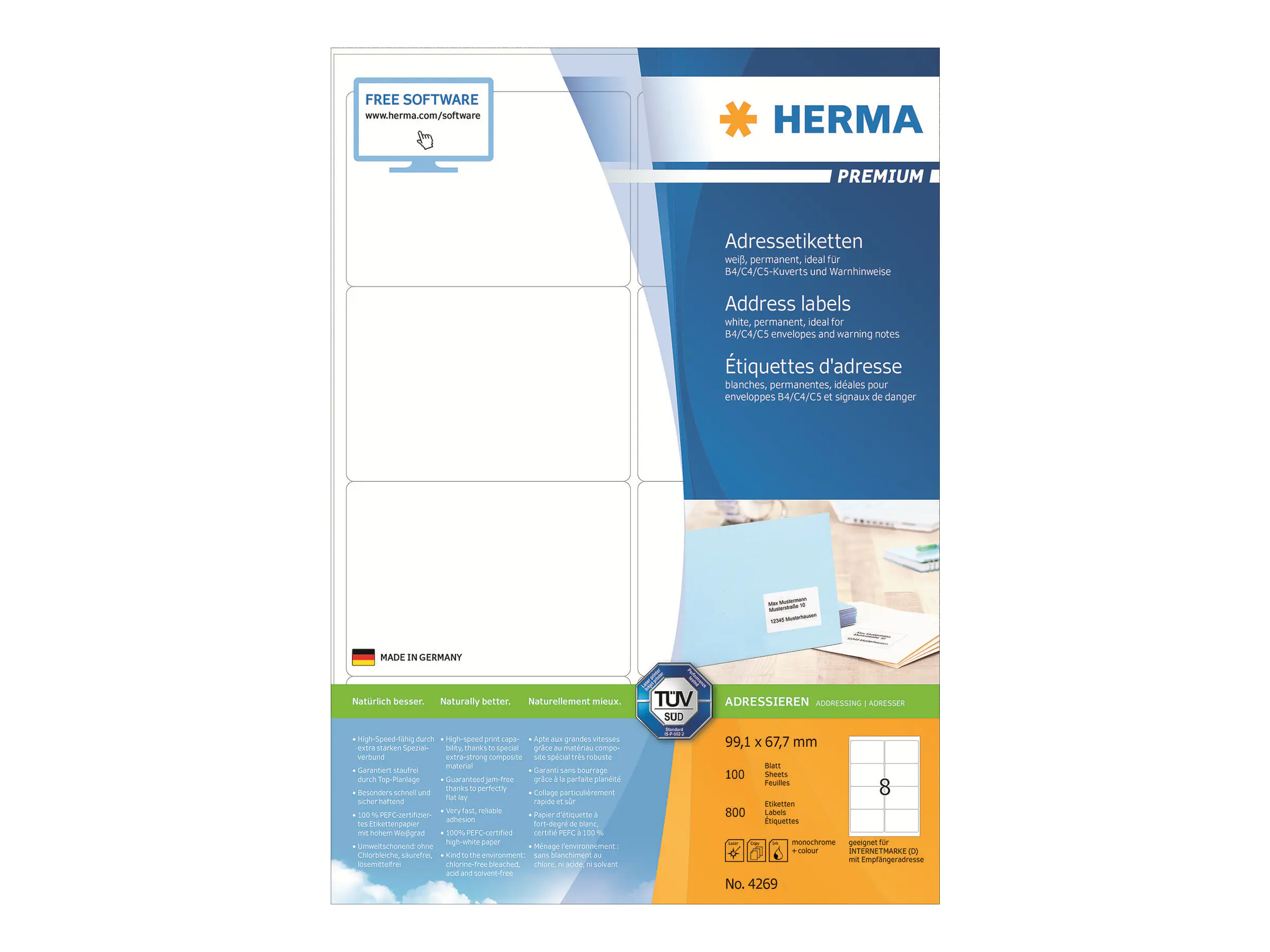 Beschreibung | HERMA Premium - Papier - matt - permanent selbstklebend - weiß - 99.1 x 67.7 mm 800 Etikett(en) (100 Bogen x 8) laminierte Adressetiketten | |||