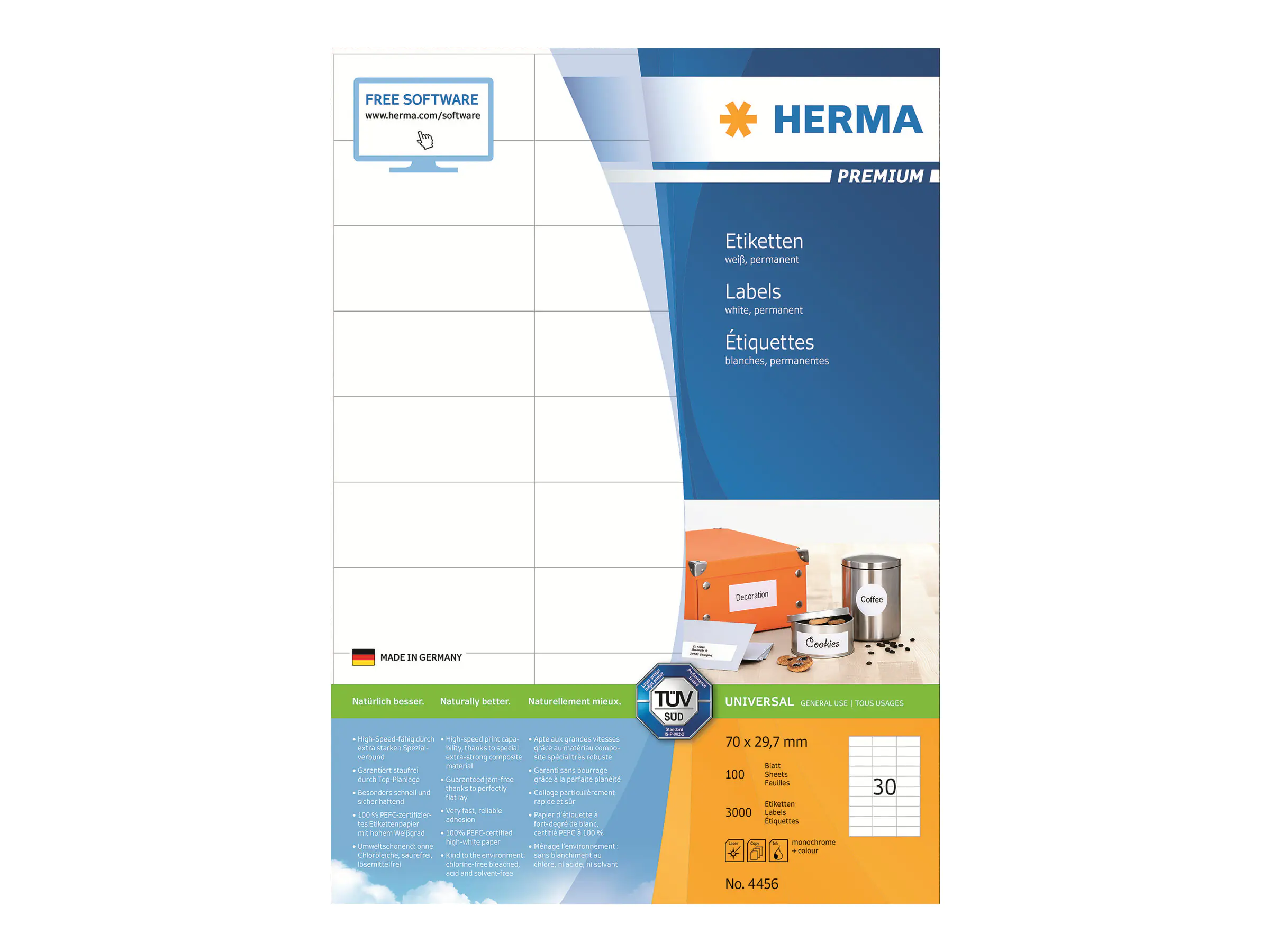 - Premium Etiketten auf A4-Blättern, schnell und sicher permanent haftend