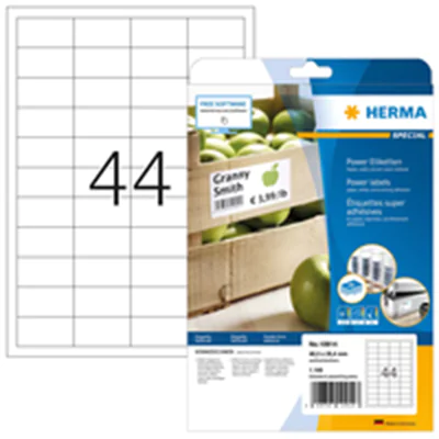 HERMA Etiketten A4 48.3x25.4 mm weiß extrem stark haftend Papier matt 1100 St.. Produktfarbe: Weiß, Form: Rechteck, Klebetyp: Dauerhaft. Breite: 48,3 mm, Höhe: 25,4 mm. Aufkleber pro Satz: 1100 Stück(e), Haftetiketten pro Blatt: 44 Stück(e), Medienanzahl pro Paket: 25 Blätter