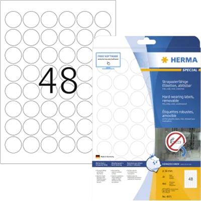Beschreibung | HERMA Special - Matt - selbstklebend, entfernbarer Klebstoff - weiß - 30 mm rund 960 Etikett(en) (20 Bogen x 48) Folienetiketten | |||