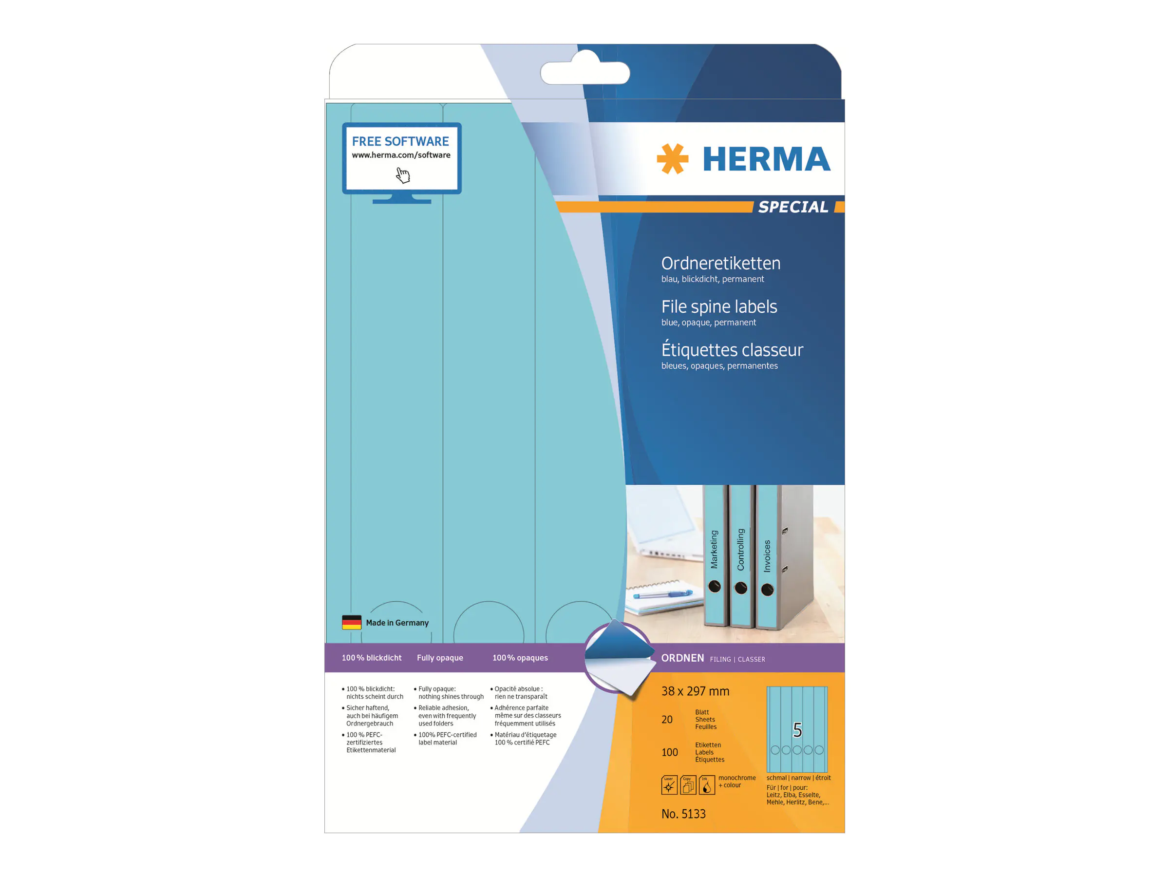 HERMA Ordneretiketten 5133 DIN A4 38x297mm blau 100 St./Pack