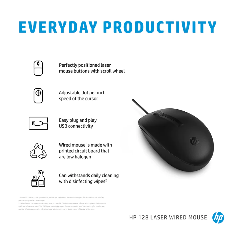 - Unsere Designerfahrung und unser Know-how spiegeln sich in der kabelgebundenen HP 128 Lasermaus wider. Diese Maus verfügt über eine jeweils perfekt positionierte linke und rechte Maustaste und ein Scrollrad, damit Sie den ganzen Tag lang bequem arbeiten können. Sogar die Empfindlichkeit des Cursors lässt sich einstellen.