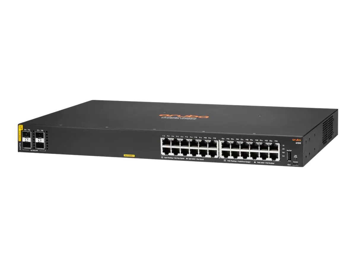 HPE Aruba 6100 24G Class4 PoE 4SFP+ - Switch - managed - 24 x 10/100/1000 + 4 x 1 Gigabit / 10 Gigabit SFP+ - Seite-zu-Seite-Luftstrom - an Rack montierbar - PoE+ (370 W)
