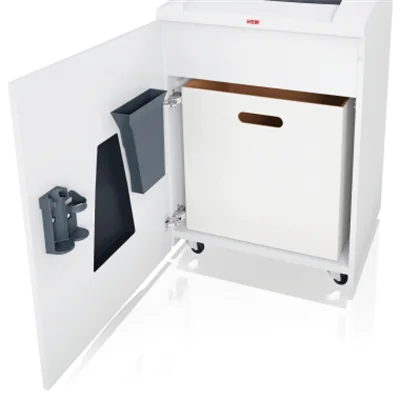 Der Top-Aktenvernichter der HSM SECURIO P-Serie mit IntelligentDrive und Touchdisplay. Dieses Kraftpaket verarbeitet zuverlässig große Papiermengen und ist damit bestens geeignet für Abteilungen. Der volle Auffangbehälter wird mittels Anzeige signalisiert und das Gerät schaltet automatisch ab. Der kraftvolle Motor stellt eine hohe Schnittleistung und den zuverlässigen Dauerbetrieb sicher. Besonders geringer Stromverbrauch von 0,1 W im Stand-by-Modus durch das intelligente Steuerungskonzept EcoSmart. Nach Öffnen der Tür kann der herausziehbare Mehrweg-Auffangbeutel komfortabel entnommen und geleert werden. Der Aktenvernichter verfügt über einen robusten Holzunterschrank mit extra großem Tür-Öffnungswinkel. Über die intelligente Vermeidung von Papierstau erkennt das System automatisch und frühzeitig, ob zu viel Papier zugeführt wurde. Das Gerät reversiert oder ruft kurzzeitig mehr Leistung ab und zieht das Papier ein. Der leise Betriebsmodus minimiert die Geräuschentwicklung am Arbeitsplatz. Ein leichter Druck auf das Sicherheitselement verhindert den unbeabsichtigten Einzug und stoppt sofort die Papierzufuhr. Die Bedienung ist denkbar einfach: Bei Papierzufuhr startet das Gerät automatisch und stoppt selbstständig nach dem Schreddern. Die induktionsgehärteten Vollstahl-Schneidwellen mit lebenslanger Garantie sind unempfindlich gegen Heft- und Büroklammern und garantieren Langlebigkeit. Das innovative Antriebs- und Bedienkonzept IntelligentDrive bietet drei Betriebsmodi für eine besonders leise, normale oder eine Aktenvernichtung mit bis zu 40 % höherer Leistung. Durch das Sichtfenster ist der Füllstand des Auffangbehälters jederzeit einsehbar. Das separate Medien-Schneidwerk mit Auffangbehälter zerkleinert mühelos CDs/DVDs, Kredit- und Kundenkarten sowie Disketten in kleine Partikel (4 x 7 mm). Das geschredderte Material kann sortenrein entsorgt werden.