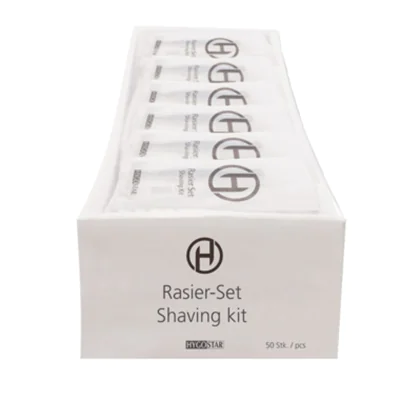 Rasierer und Creme befinden sich in einer hygienischen, klassisch weißen Einzelverpackung. Das Set ist sofort einsatzbereit und ideal als Service für Hotelgäste und Wellnessbereiche.