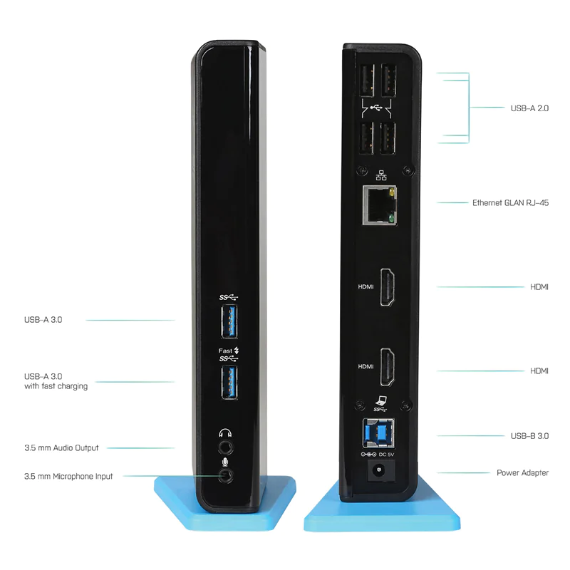 Die Station unterstützt bis zu 2 externe Bildschirme, die über HDMI-Ports angeschlossen werden können. 6x USB-Port, zuverlässige und schnelle Internetverbindung aufgrund des integrierten LAN-Ports sowie Unterstützung des Audioeingangs und -ausgangs.