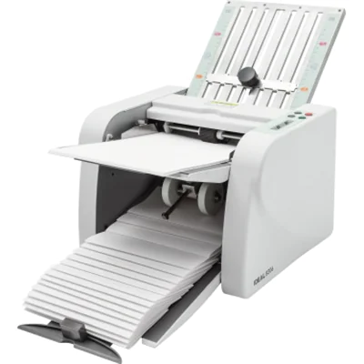Kompakte Büro-Falzmaschine mit vier Falzarten und Bandauslage. Ausklappbarer Zuführtisch für 150 Blatt Papier. Falzgeschwindigkeit. Einfache Einstellung der Falzarten über Symbole und Farbcodes. Abschaltautomatik mit Displayanzeige beim Aufklappen von Gehäuseteilen. Automatische-Endabschaltung. Einfache Bedienung über Start-/Stoppschalter. Display mit Fehleranzeigen. Zähler für Addition (Totalzähler) oder Subtraktion (Vorwahlzähler). Bandauslage mit verstellbarer Papierauswurfrolle zur kontrollierten Ablage des gefalzten Papiers.