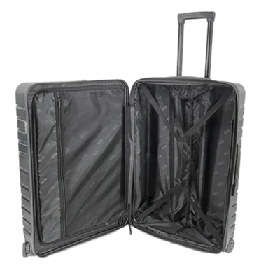 - Arretierbares Teleskoptrolleysystem, Dehnfalte, vier 360 Grad Leichtlaufrollen, Beidseitige Packmöglichkeit durch Packtrennwand und Packgurt