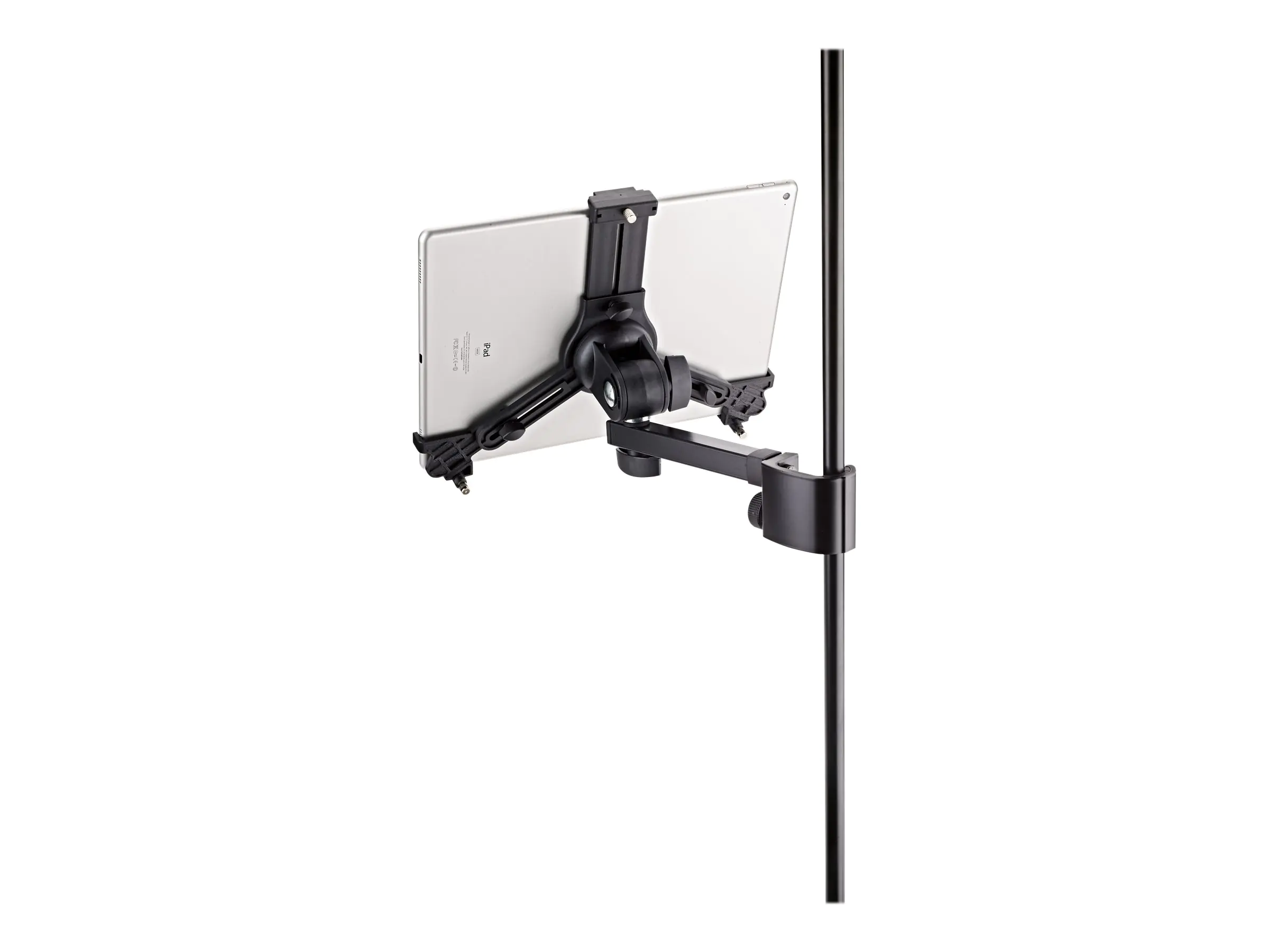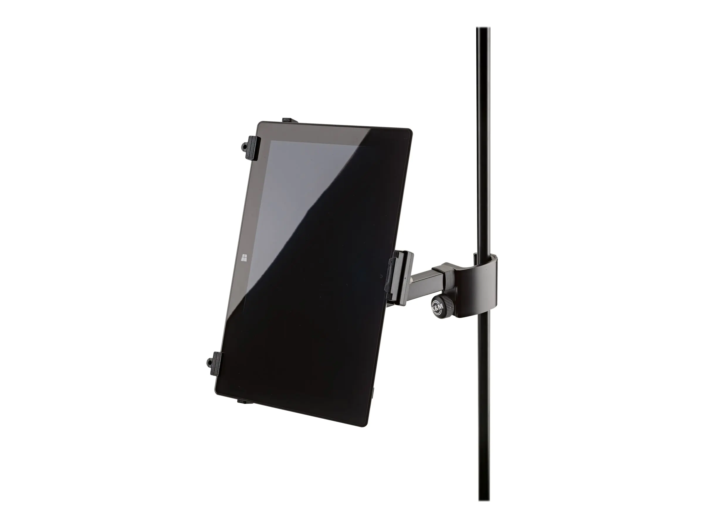 Diese universelle Tablet-Halterung ist stufenlos auf verschiedene Tablet-Größen ohne Werkzeug einstellbar und hält das Gerät garantiert sicher und effektvoll bei vielen Gelegenheiten. Egal ob auf der Bühne, im Proberaum oder zu Hause - dank des starken Klemmelements mit der ergonomischen Klemmschraube kann der Halter an jedes Rohr bis 30 mm Durchmesser schnell und einfach befestigt werden. Die individuell einstellbaren Haltearme ermöglichen den Einsatz von Tablets mit einer Höhe von 222 bis 334 mm und einer Breite von 128 bis 232 mm. Die Tiefe des Tablets kann dabei zwischen 6 und 11 mm variieren. Beim erstmaligen Einstellen werden die drei Haltearme mittels Klemmschrauben auf die Größe und Tiefe des Tablets eingestellt. Für die weitere Nutzung wird das Tablet dann ganz einfach und schnell über einen Schnappverschluss eingesetzt und auch wieder entnommen. Eine handliche Flügelmutter ermöglicht die stufenlose Einstellung der Neigung, so dass jeder Anwender seine individuelle Position leicht finden kann. Das Tablet kann zwischen Hoch- und Querformat kurzerhand gedreht werden, wobei ein selbstständiges Drehen verhindert wird.