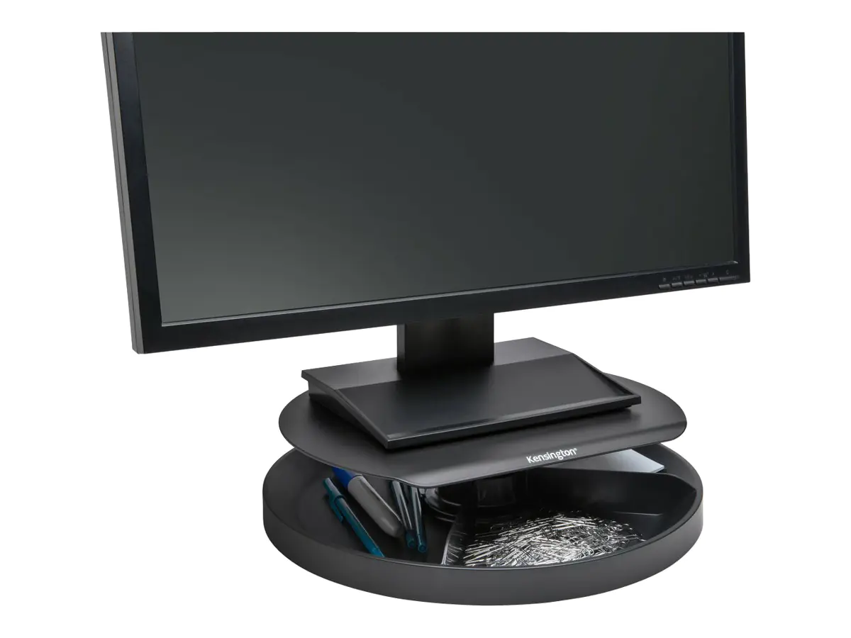 Mit der unter der Plattform angebrachten, patentierten, um 360° drehbaren Ablage mit mehreren Fächern sind Ihre am häufigsten verwendeten Schreibtischutensilien immer griffbereit. Kensingtons patentiertes SmartFit-System ermöglicht individuelles Abmessen, Anpassen und Einstellen, damit Sie die Monitorhöhe auf die für Sie ergonomisch passende Farbeinstellung festlegen können. Der Fuß platziert den Monitor auf Augenhöhe, um Nacken und Schultern zu entlasten. Kleine Standfläche lässt wertvollen Platz auf dem Schreibtisch frei. Plattformdesign passend für die meisten Widescreen-Monitore.