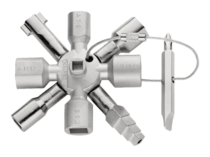 Durchdachte Ausstattung, hochwertige Verarbeitung, gewichtsoptimiert. Multifunktionaler Schlüssel für Betätigung von Schließungen aus den Bereichen Gebäudetechnik (Heizung und Sanitär, Klima- und Belüftungstechnik, Elektrotechnik), Gas- und Wasserversorgung und Absperrsysteme. Der achtstrahlige KNIPEX TwinKey® besteht aus zwei Kreuzen, die mit einem Magneten ineinander gesteckt werden. Schlüssel: Doppelbart (3-5 mm), Dreikant (7-8, 9-10, 11-12 mm), Vierkant (5, 6-7, 8-9, 10-11 mm), Stufen-Vierkant (6-9 mm), Halbmond (6 mm). Schlüssel und Wendebit durch stabiles Edelstahl-Drahtseil verbunden. Wendebit (Schlitz 1 x 7 mm, Kreuzschlitz PH2).