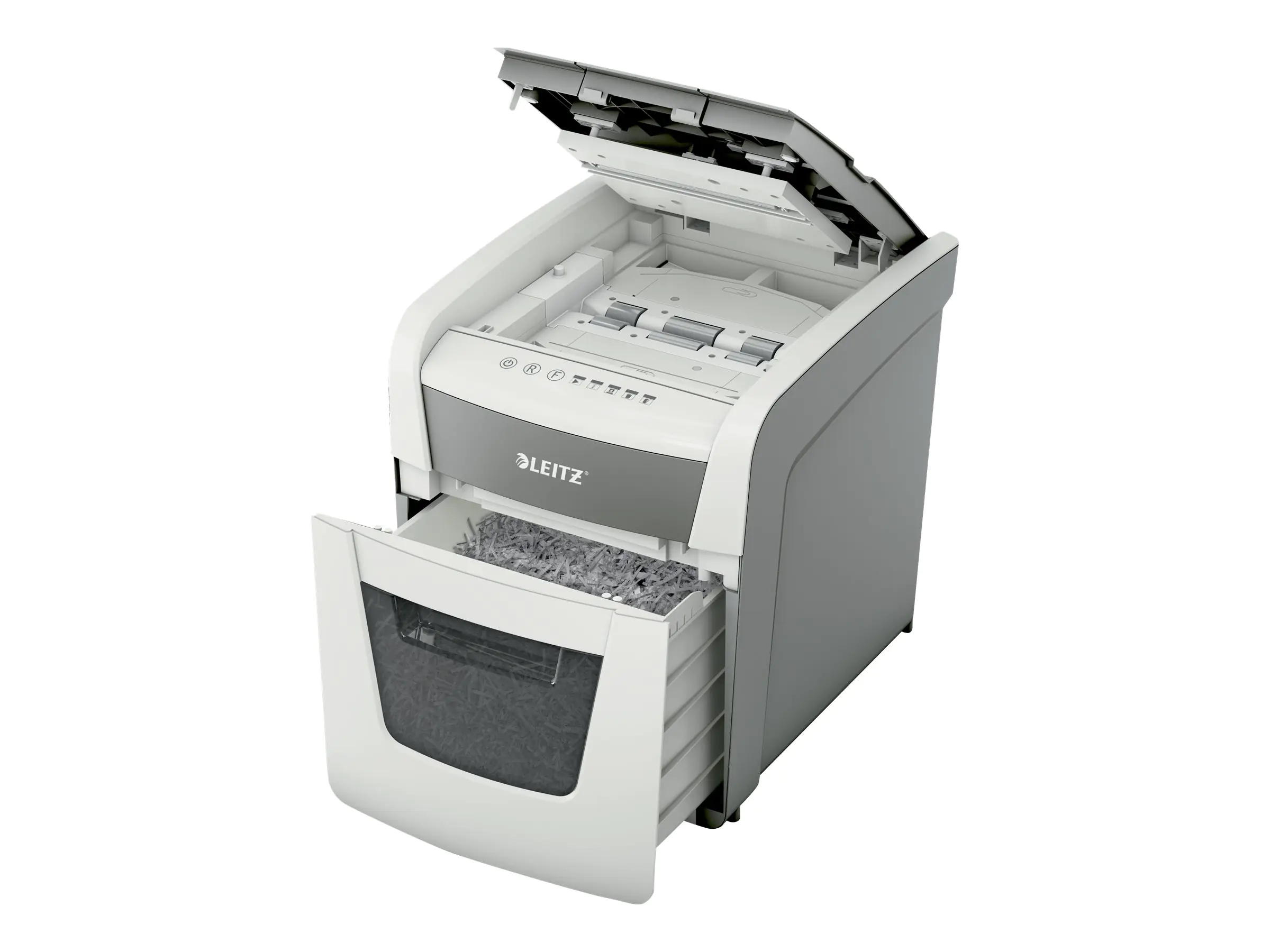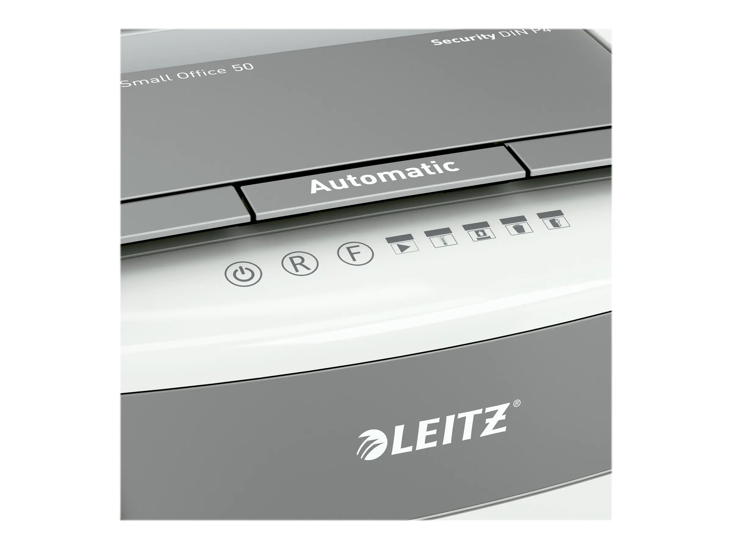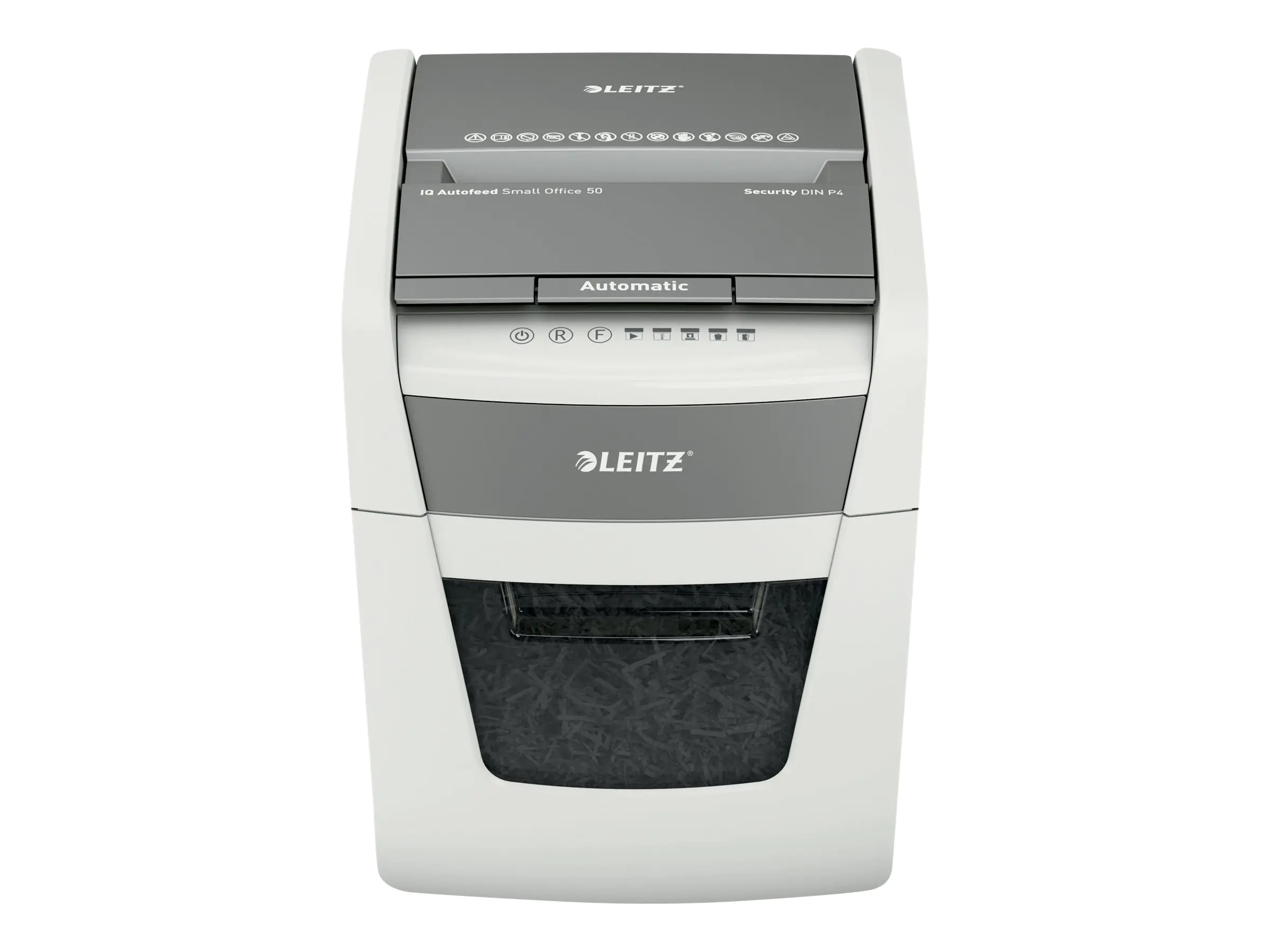 Leitz Aktenvernichter IQ Autofeed Small Office 50. Elektrischer, vollautomatischer Aktenvernichter für Home Office oder kleine Büros mit 1-5 Benutzern. Der zu vernichtende Papierstapel wird einfach in das Gerät eingelegt und das Gerät arbeitet selbstständig. Mit einzigartiger Funktion für eine saubere Entleerung des Abfallbehälters: Die Schneidewellen laufen nach jedem Vorgang kurz rückwärts um zu verhindern, dass beim Herausziehen Papierschnipsel hinter den Abfallbehälter fallen. Automatische Papierzuführung. Mit Touch Control und Anti-Papierstau-Technologie. Mit Autoreverse und Auto Start/Stop. Mit Infrarot-Sensoranzeige für vollen Abfallbehälter. Sehr leiser Betrieb. Mit Laufrollen für mehr Mobilität. Einfach zu leerender, herausziehbarer Abfallbehälter.