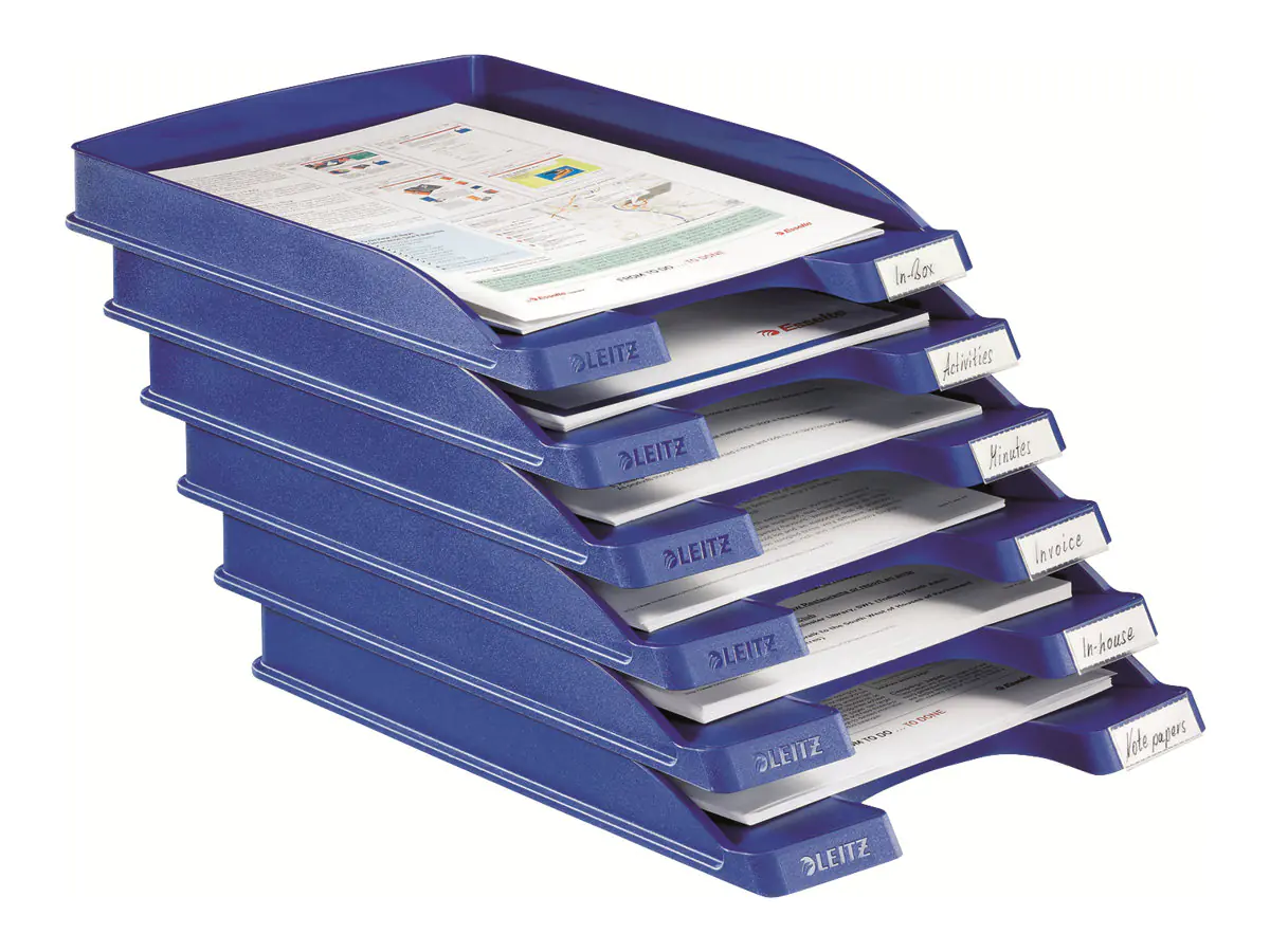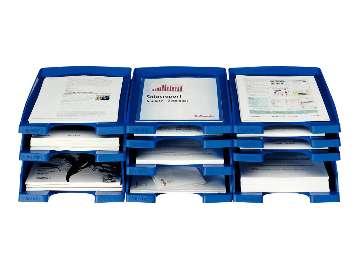 Senkrecht oder versetzt stapelbar, auch mit den Leitz Briefkörben 5227, 5226, 5233 und 5217.