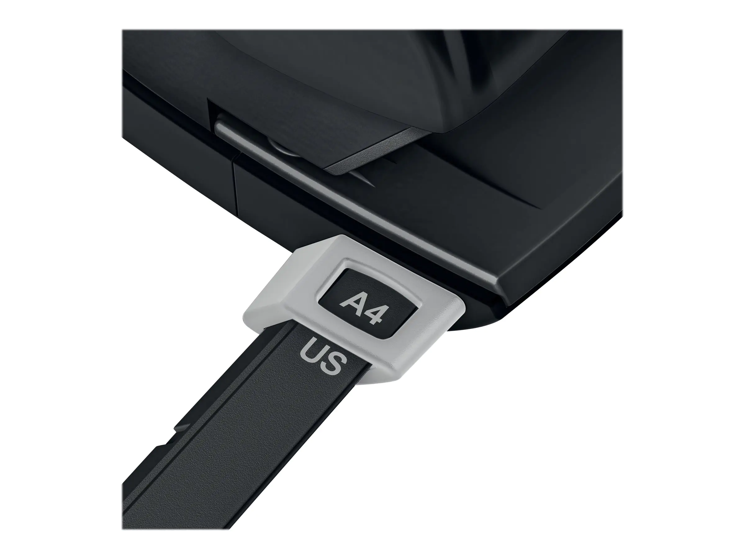 - Klar erkennbare Formatangaben und die sicher einrastende Anschlagschiene sorgen für ein sauberes und bündiges Einle.g.en des Papiers
