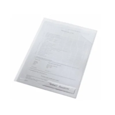 Hülle CombiFile - eine Kombination aus Sicht- und Prospekthülle. Mit einklappbarem Lochrand, mit Verschlußlasche rechts oben und Beschriftungsstreifen.