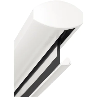 Die stationäre Motorbildwand im optisch anspruchsvollen Design für Home-Entertainment sowie Büro- und Konferenzräume.rückseitig integrierte Nutenkanäle, in denen die Befestigungswinkel frei verschiebbar sind und somit leicht an die individuellen, räumlichen Bedingungen angepasst werden können (VMS-Montagewinkel); dadurch entsteht ein hoher Montagekomfort für die direkte Wand- oder Deckenbefestigung. Der untere, trapezförmige Beschwerungsstab schließt das Schutzgehäuse der Bildwand beim Einfahren bündig ab.