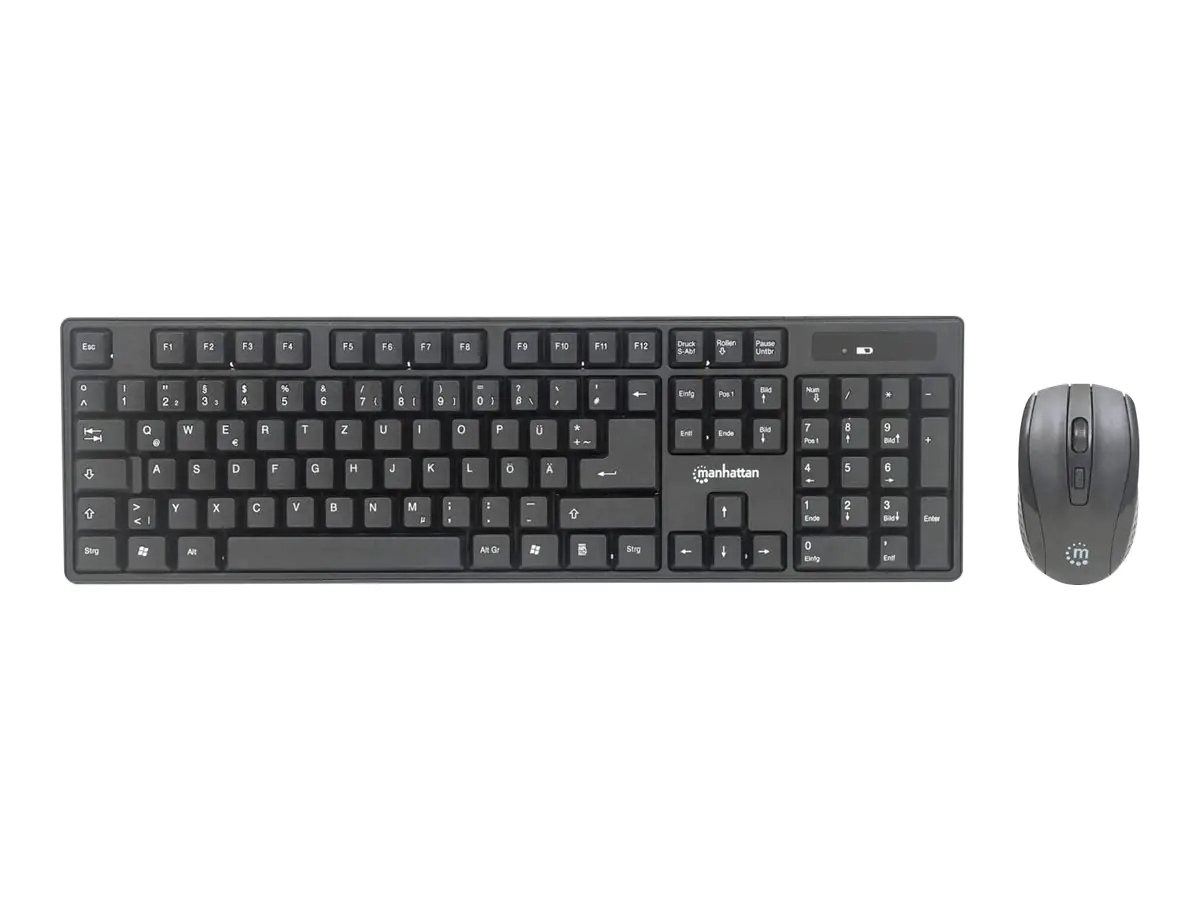 Manhattan Wireless Desktop Set mit Funktastatur und Funkmaus, Ein einzelner 2,4 GHz USB-Funkempfänger zur Verbindung von beiden Geräten, schwarz. Tastatur Formfaktor: Full-size (100%). Tastatur-Stil: Gerade. Geräteschnittstelle: RF Wireless, Tastaturaufbau: QWERTY, Empfohlene Nutzung: Büro. Produktfarbe: Schwarz. Maus enthalten