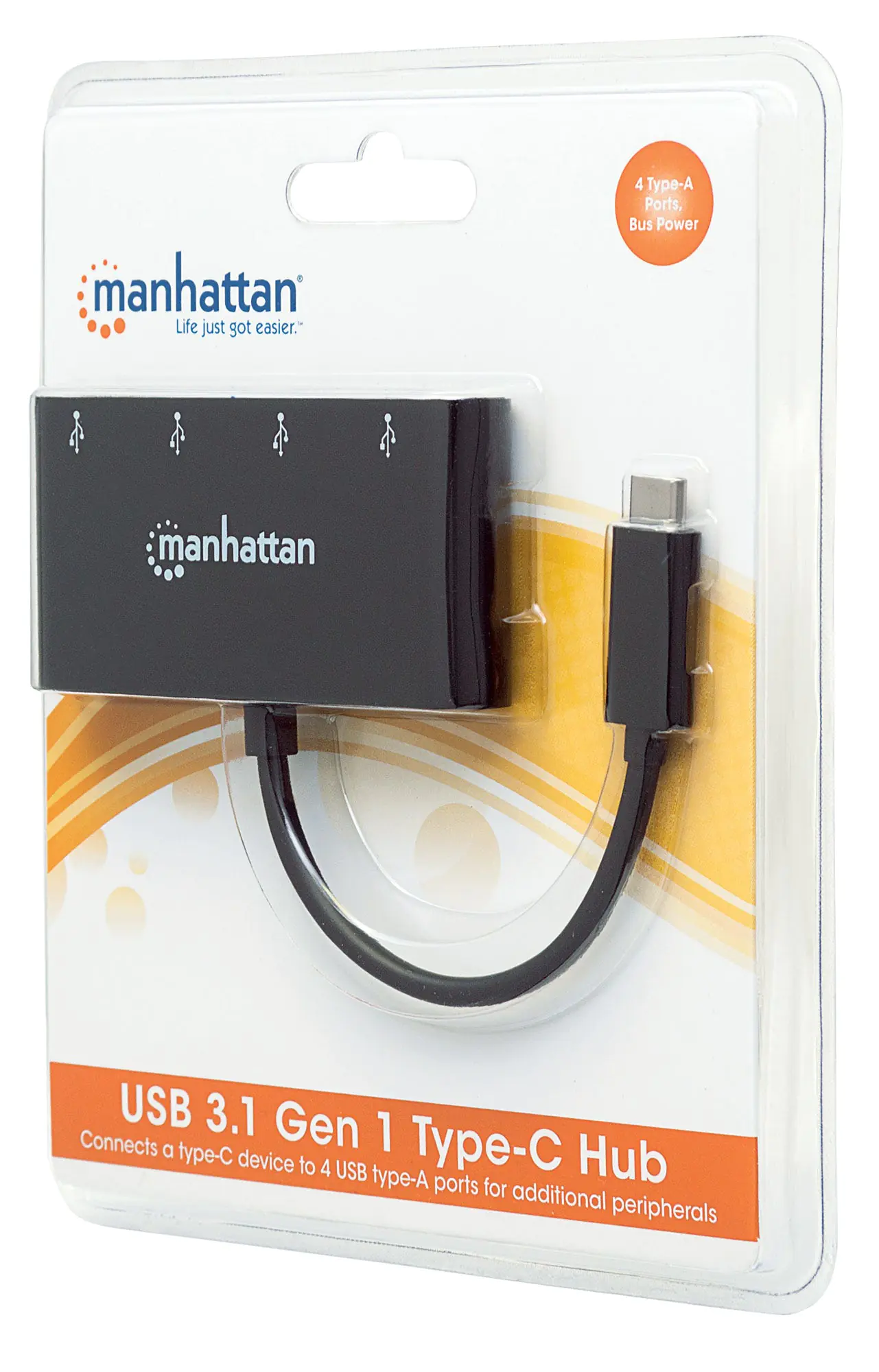 Manhattan USB-C Dock/Hub, Ports (x4): USB-A (x4), 5 Gbps (USB 3.2 Gen1 aka USB 3.0), External Power Supply Not Needed, Cable 20cm, SuperSpeed USB, Black, Three Year Warranty, Blister - Hub - 4 x USB 3.1 Gen 1 - Desktop