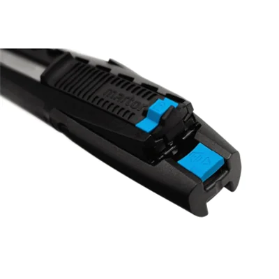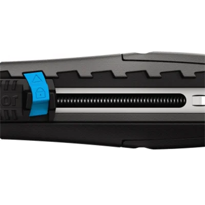 Ein Sicherheitsmesser, das auch als Cuttermesser performt? Das neue SECUBASE 383 kann beides. Ihr Schneidwerkzeug ist zunächst einmal mit einem automatischen Klingenrückzug ausgestattet, um Schnittverletzungen zu vermeiden. Bestimmte Schneidanwendungen gehen aber mit fixierter Klinge besser von der Hand, darunter auch der Sägeschnitt. Dafür können Sie optional die Klinge in sieben verschiedenen Stufen arretieren. So lässt sich effizient arbeiten. "Lang" ist eigentlich untertrieben: So können Sie mit dem SECUBASE 383 mühelos z.B. 4-lagige Kartons, Sackwaren, Papierbahnen und -rollen, Bauschaum und Styroporplatten sicher schneiden. Um an die lange, biegsame Klinge zu gelangen, nutzen Sie den blauen Klingenwechselknopf am Ende des Griffs. Jetzt können Sie das Innenteil inkl. Schieber herausziehen. Die Klinge wird von zwei Magneten in Position gehalten.