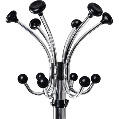 Elegante Standgarderobe für starke Belastung. Verchromt: Säule und Haken hochglänzend. Schwerer Fuß mit Bodenschonern aus Filz, glänzend mit matt erodierter Fläche, kratzhemmend für Schirmspitzen. Abgerundete Kunststoffköpfe sitzen fest und wackeln nicht und schonen die Kleidung. 6 Huthaken Ø 5,5 cm, 6 Jackenhaken Ø 3,8 cm, je 4 zusätzliche Haken an der Säule und am Schirmständer. Drehbare Krone für bequemen Zugriff von allen Seiten. Schirmhalter, Ø 27 cm, für bis zu 8 Schirme und 4 Taschenschirme. Einfache Montage.