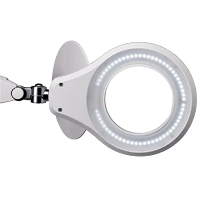 Lupe und funktionelle Arbeitsplatzleuchte. Ideal für präzise Arbeiten in Laboren, Werkstätten, technischen Büros, Arztpraxen. Oder im Privatbereich für Briefmarkensammler, Feinmechaniker oder als Leselupe. Ringförmig angeordnete LEDs für gleichmäßige Ausleuchtung. Diffusor für geringen Schattenwurf. Dreidimensional verstellbarer Leuchtenkopf. 3 Dioptrien-Linse, Linsenfläche 126 cm². Inklusive Schutzklappe, die Sonneneinstrahlung und Verstauben verhindert. Parallelogramm-Metallarm, elegant verkleidet. Dieses Produkt wird verkauft mit einer austauschbaren Lichtquelle der Energieeffizienzklasse E.