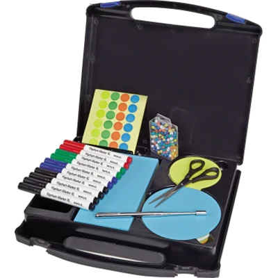 Ideale Grundausstattung für "die kurze Moderation" oder für unterwegs. Ordnungssystem durch tiefgezogenes Innenteil. Zusätzliches Staufach für persönliche Arbeitsmittel. Inhalt: 10 Flipchart-Marker XL Rundspitze 2-2,5 mm (4 x schwarz, 2 x rot, 2 x blau, 2 x grün), je 120 Moderationskarten Ø 9,5 cm, Ø 13,5 cm, 20,5 x 9,5 cm (weiß, gelb, orange, rot, grün, blau), 200 Signal-Nadeln (farbig sortiert), Teleskop-Zeigestab mit Kugelschreiber. 480 Klebepunkte (farbig sortiert), 1 Schere mit Kunststoffgriff (16 cm, Edelstahl).