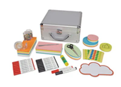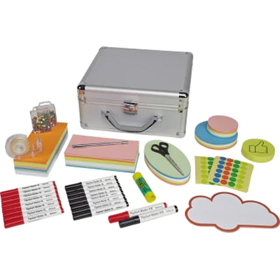 Für professionell ausgestattete Workshops und Moderationen. Ergonomisch geformter Griff, solide Protektoren an den Ecken. Tiefgezogenes Innenteil als Ordnungssystem. Inhalt: 16 Flipchartmarker XL Rundspitze 2-2,5 mm (je 8 x rot, schwarz), 2 Flipchartmarker XXL Keilspitze 3-6 mm (je 1 x rot, schwarz), 1 Schere mit Kunststoffgriff 16 cm Edelstahl, 400 Signal-Nadeln (farbig sortiert), Klebefilm-Abroller inkl. Klebefilm, 1 Klebestift, 500 Moderationskarten 20,5 x 9,5 cm (farbig sortiert), 120 Moderationskarten Ø 9,5 cm (farbig sortiert), 120 Moderationskarten Ø 13,5 cm (farbig sortiert), 120 Moderationskarten oval 11 x 19 cm (farbig sortiert ), 960 Klebepunkte (farbig sortiert), 100 Moderationskarten (Daumen positiv, negativ), 20 Moderationwolken 14 x 23 cm (farbig sortiert), 1 Teleskop-Zeigestab mit integriertem Kugelschreiber.
