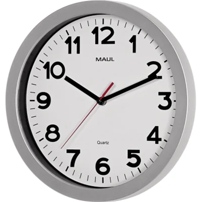 Standardmodell in ansprechendem Design. Schrift besonders gut lesbar. Dezente Optik für Büroräume oder zu Hause. Arabische Ziffern in schwarz. Achse in Zeigerfarbe. Wandbefestigung über Birnenöse.
