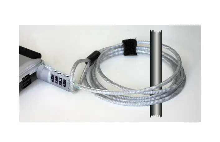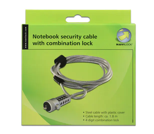 Mit diesem Navilock Notebookschloss können Sie verschiedene Geräte, wie Notebook, Beamer, Monitor etc. an jedem Ort sichern. Das 1,8 m lange Stahlkabel mit 4-stelligem Zahlenschloss lässt sich ganz einfach um Gegenstände, wie z. B. Tischbein, Stuhl oder Ähnliches anbinden und sichert somit Ihr Gerät vor Diebstahl.