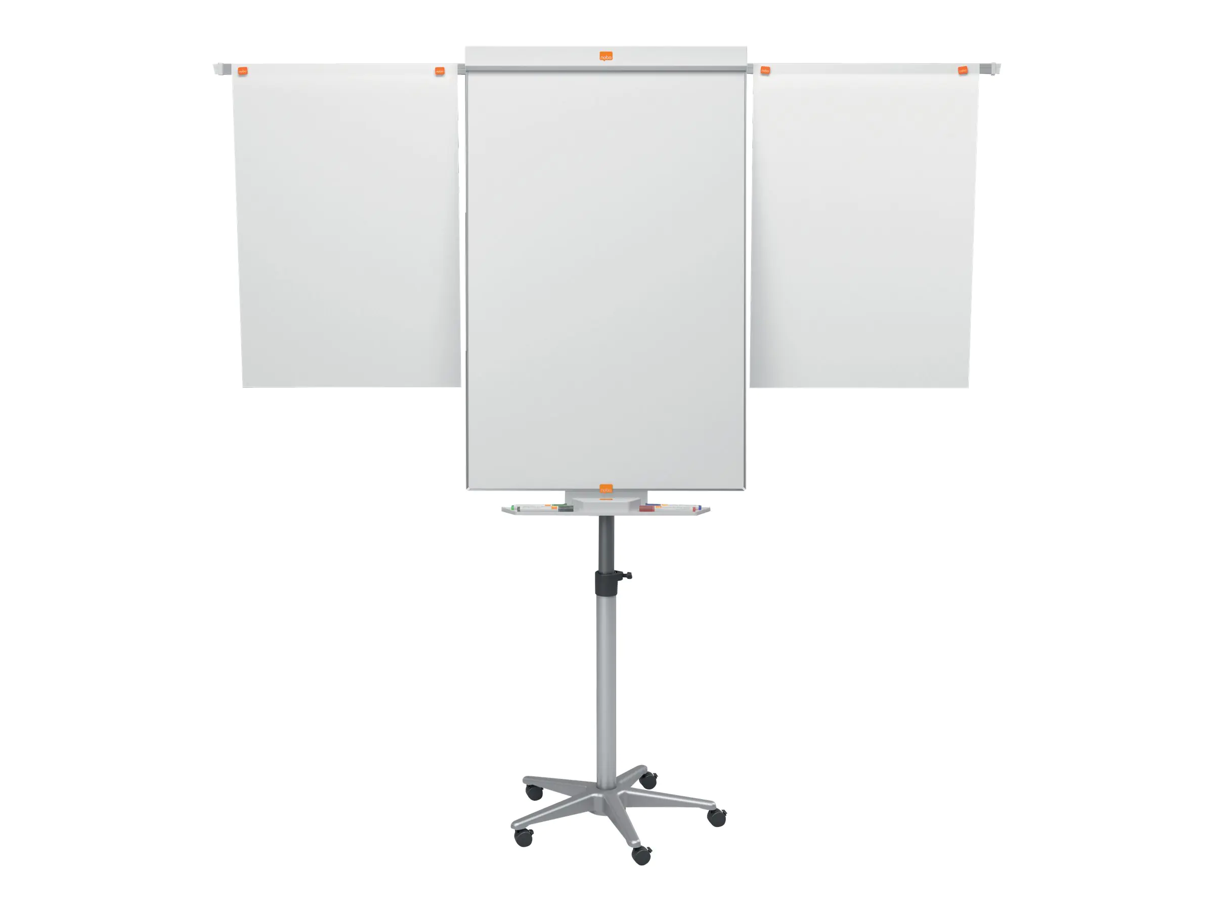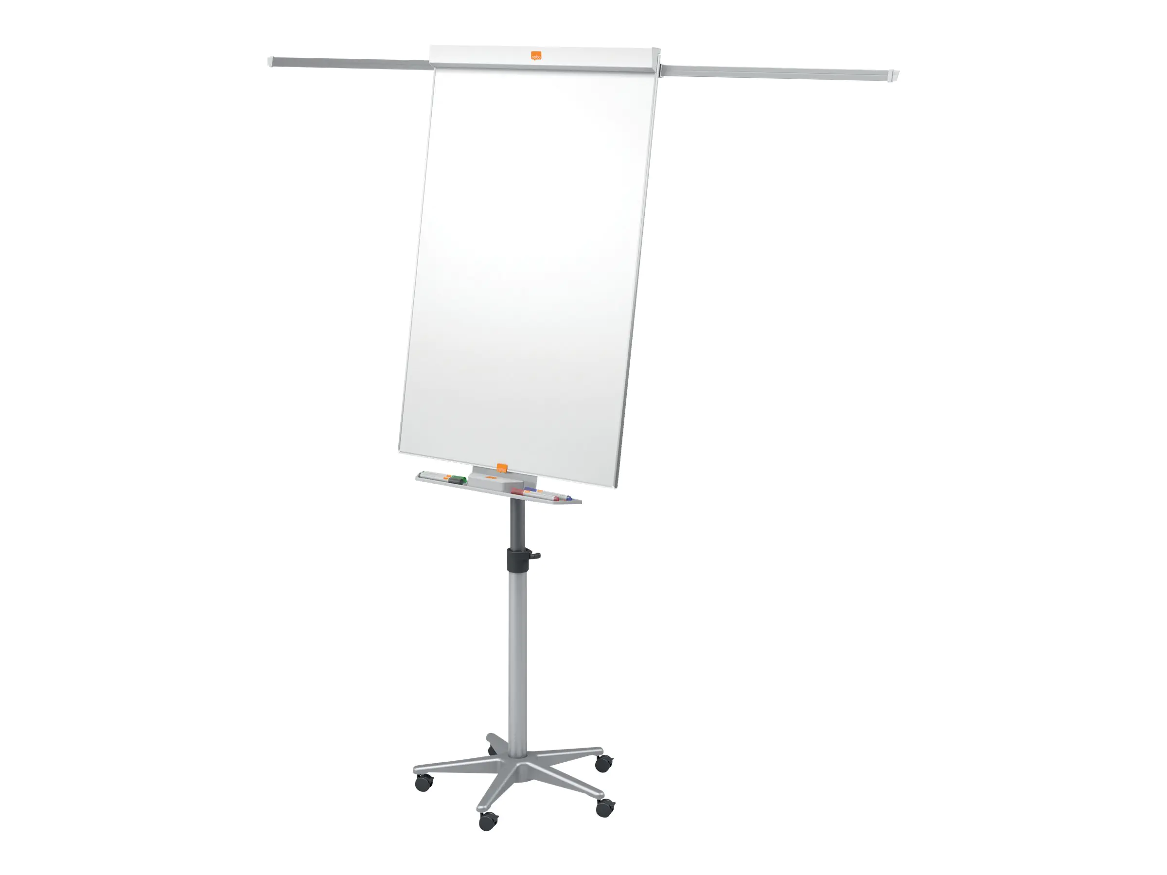 Nobo Classic magnetisches mobiles Flipchart aus Stahl mit ausziehbaren Armen. Befestigungstyp: Freistehend, Plattengröße (B x T): 1000 x 700 mm, Ausrichtung: Porträt. Höhe (min): 165 cm, Höhe (max): 195 cm, Gewicht: 1,57 kg. Verpackungsbreite: 844 mm, Verpackungstiefe: 1255 mm, Verpackungshöhe: 185 mm