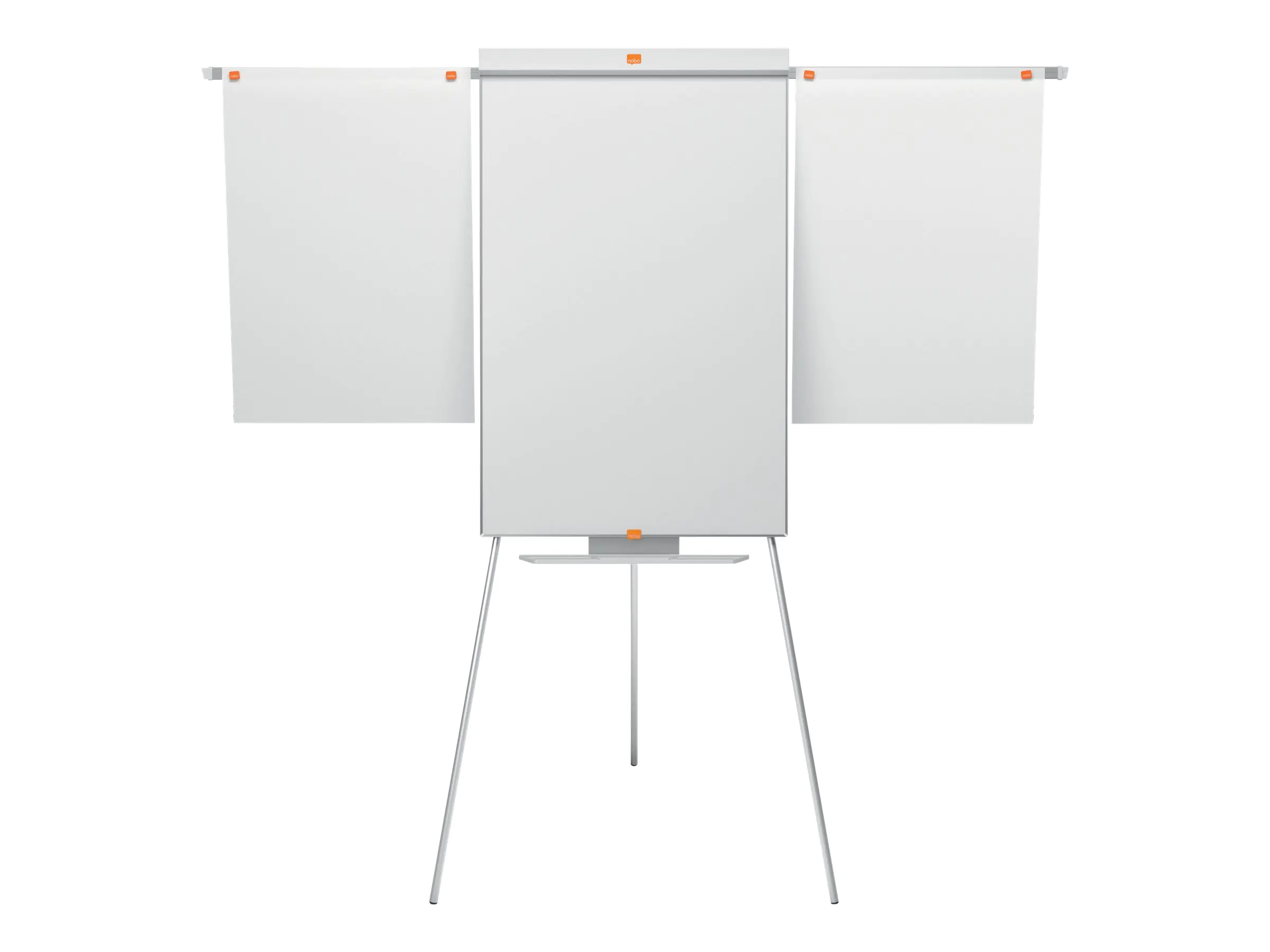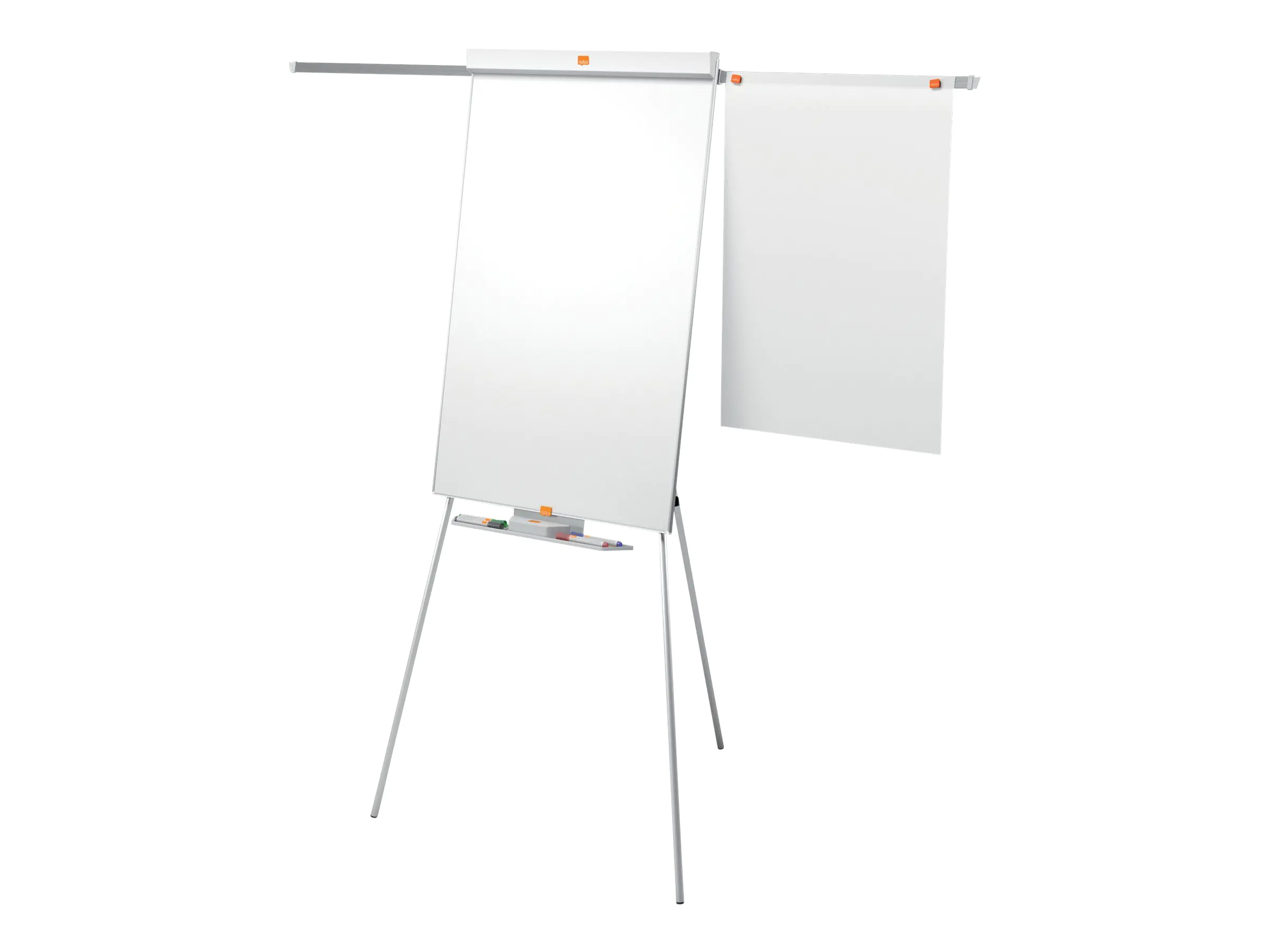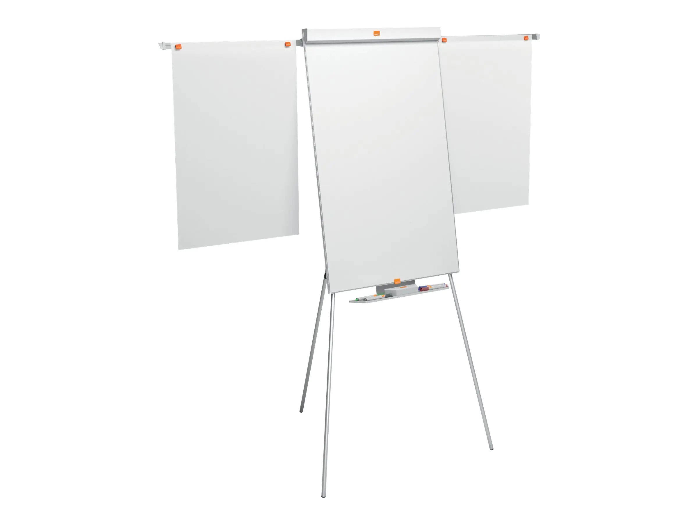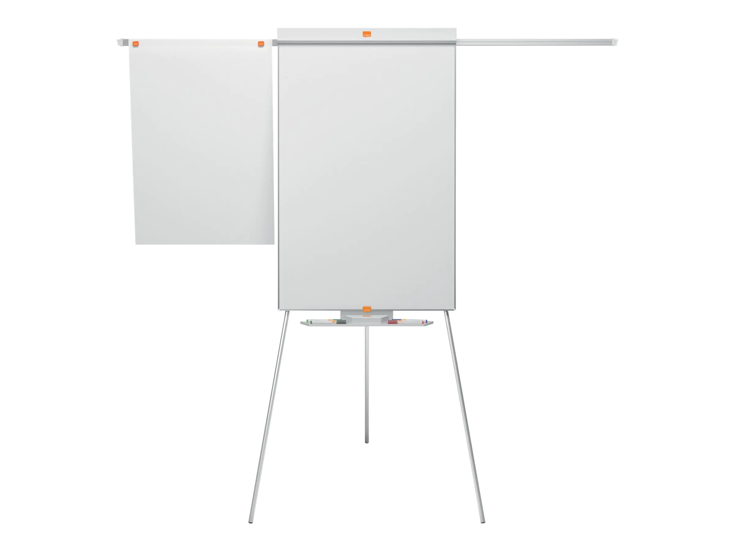 Die mobile Flipchart mit Dreibeinstativ bietet durch seinen schmalen und unauffälligen Rahmen eine maximale Schreiboberfläche. Die große Stiftablage unterhalb der Flipchart besitzt genug Platz um Marker oder Tafelwischer aufzubewahren. Dank der ausziehbaren Verlängerungsarme können rechts und links noch extra Seiten angebracht werden. Das Dreibeinstativ ist höhenverstellbar. Die Beine können vollkommen eingezogen werden und so kann die Flipchart leicht transportiert oder platzsparend gelagert werden. Haken zum Aufhängen von Nobo Flipchart-Blöcken werden mitgeliefert. Die oben angebrachte Abdeckung erleichtert das Abreisen von Papier. Die magnetische Stahloberfläche ist mühelos zu reinigen und für den regelmäßigen Gebrauch geeignet.
