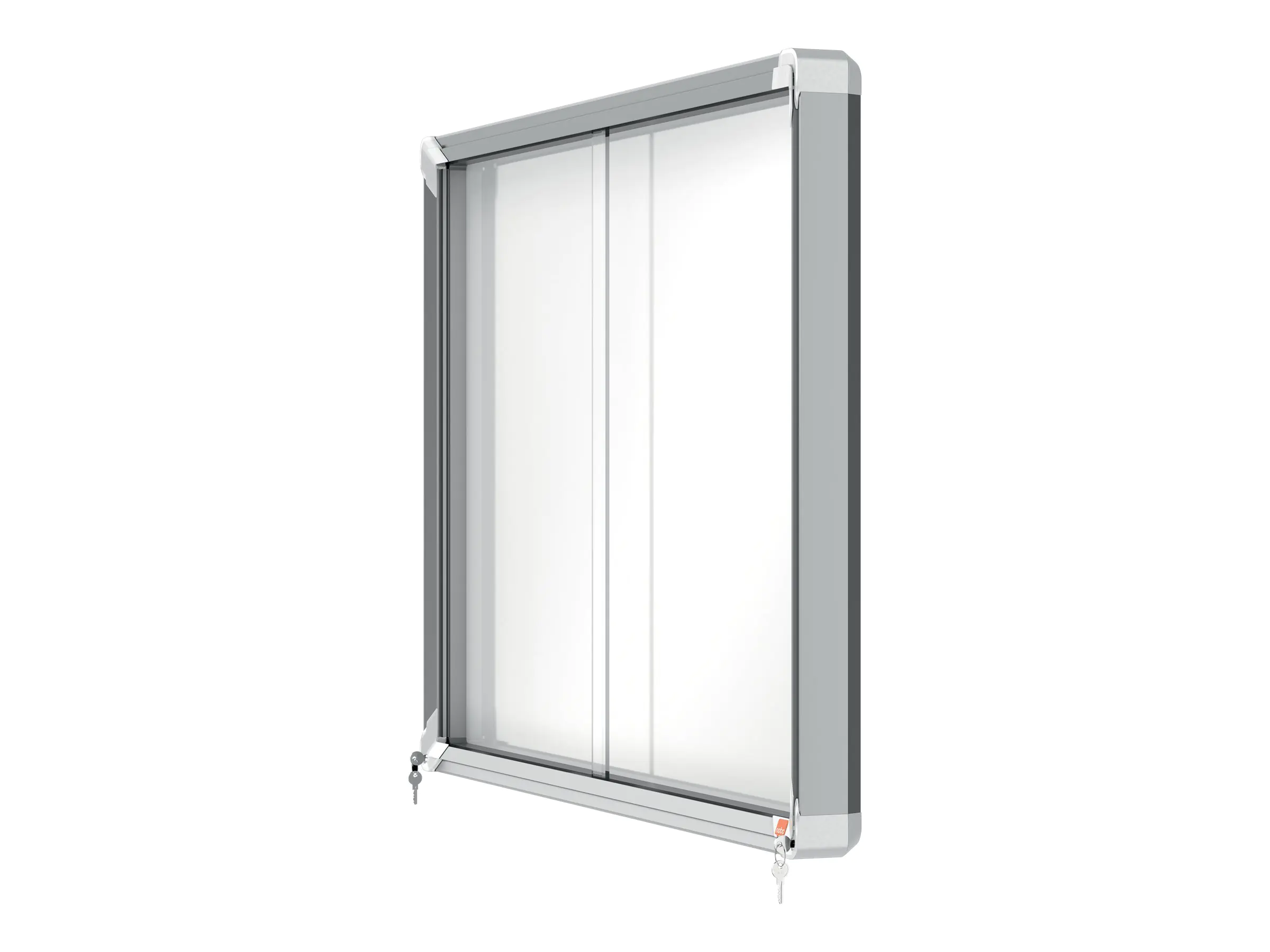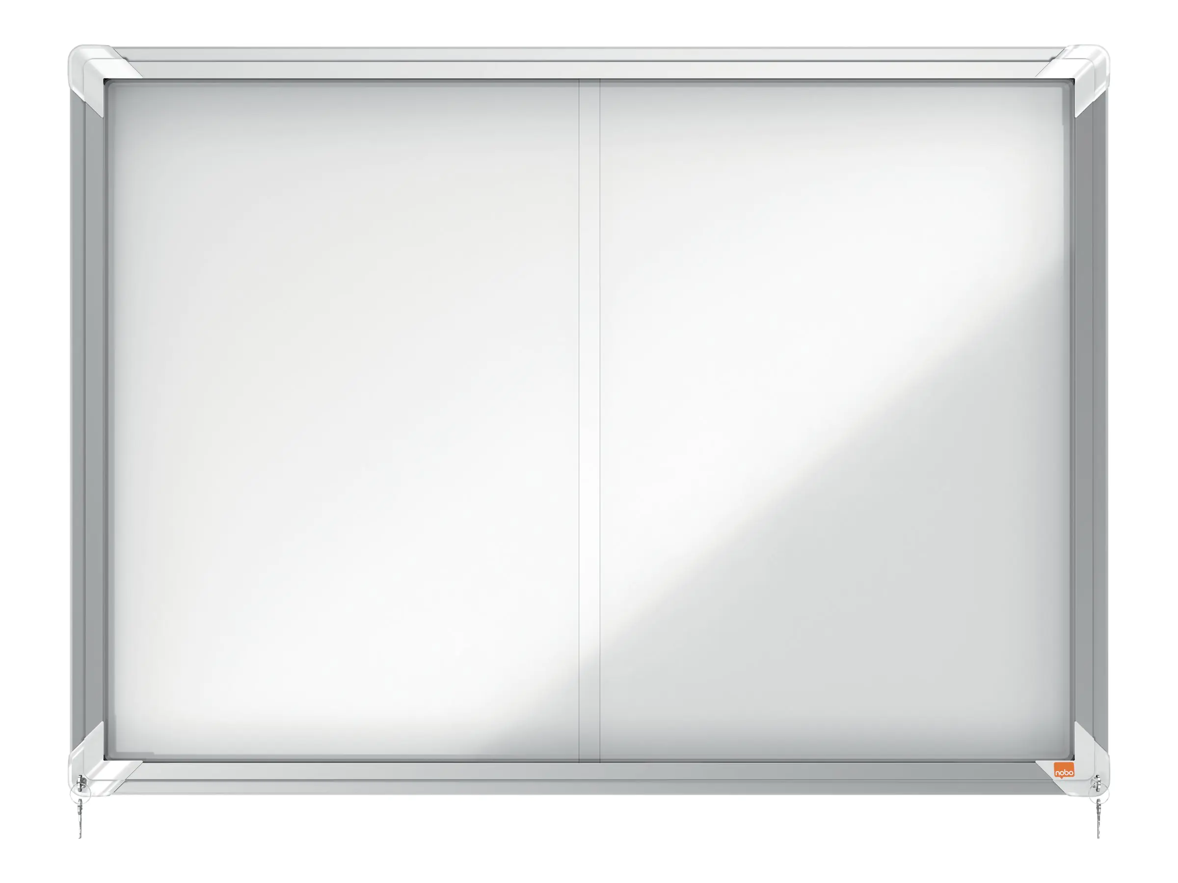 - Abschließbarer Schaukasten für den Innenbereich mit weißer, magnetischer, trocken abwischbarer Oberfläche, Schiebetür aus 4-mm-Sicherheitsglas und Sicherheitsschloss