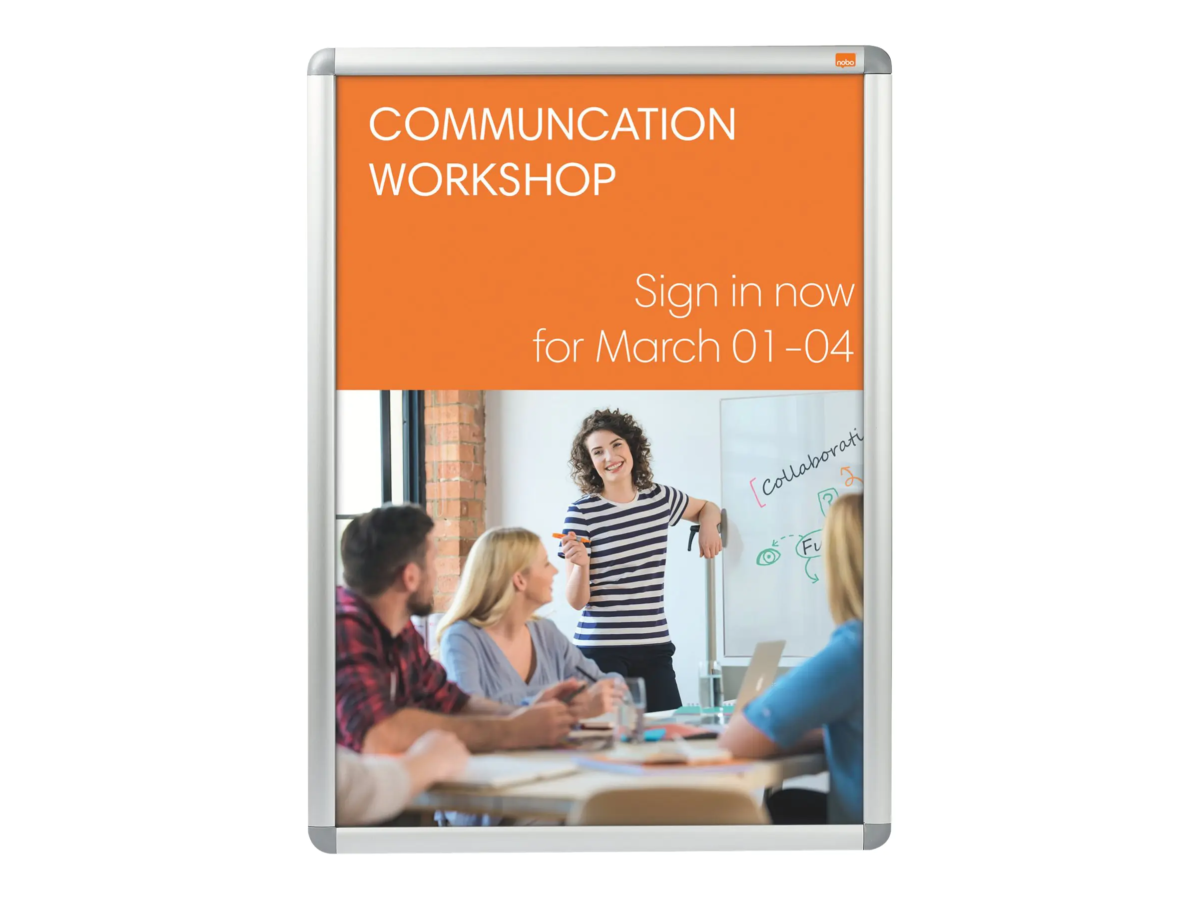 An der Wand befestigter Plakatrahmen für die Präsentation von Postern, Hinweisen und Informationen. Die praktische Aluminium-Klapprahmentechnik sorgt für einen professionellen Eindruck und erleichtert den Posterwechsel. Der stabile Plakatrahmen wird durch traditionelle Eckmontage an der Wand befestigt. Die entspiegelte PVC-Abdeckung ist einfach zu reinigen. Die perfekte Lösung für temporäre oder permanente Motivpräsentationen. Größe: A1.