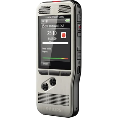 Erstklassige Aufnahmequalität mit hervorragender Ergonomie. Das PocketMemo bringt Diktierlösungen auf ein vollkommen neues Niveau. Die eingebauten Mikrofone sorgen stets für ausgezeichnete Stereo-Tonaufnahmen. Die kristallklaren Aufnahmen eignen sich perfekt für eine Spracherkennung. Mit der SpeechExec-Software wird der Workflow von Diktatdateien und fertigen Dokumenten zwischen Autor und Schreibkraft organisiert und der Status Ihrer Arbeit lässt sich verfolgen. Mit der integrierten Prioritätsfunktion können dringende Aufnahmen mit Vorrang behandelt werden. Dies gewährleistet, dass wichtige Aufnahmen nicht übersehen werden, und Sie und Ihre Schreibkraft können Aufgaben besser verwalten. Das Aufnahmegerät wurde für die einhändige Bedienung sämtlicher Aufnahme- und Wiedergabefunktionen entwickelt und ermöglicht eine schnelle Dateibearbeitung (Einfügen, Überschreiben, Anhängen) über eine bequeme Drucktaste. Das große Farbdisplay bietet eine scharfe Auflösung und erleichtert es, alle Anzeigen auf Anhieb zu erkennen. Die übersichtliche Benutzeroberfläche wurde für eine einfache und intuitive Bedienung optimiert. Das DSS-Format wurde zur Verwendung in digitalen Aufnahmegeräten entwickelt, da es eine hohe Kompressionsrate bei geringem Qualitätsverlust ermöglicht. Mit dem DSS-Format können außerdem im Dateiheader ergänzende Informationen gespeichert werden, was die Dateiorganisation und die Transkription von Diktatdateien vereinfacht. Das MP3- Format ist das gängigste Audioformat zum Speichern von Audiodateien und wird als Standardcodierung für die Übertragung und Wiedergabe von Aufnahmen auf digitalen Audiogeräten verwendet. Die asymmetrische und ergonomische Form passt perfekt in die Hand. Das schlanke und leichte Design sorgt für maximalen Komfort, selbst beim Arbeiten über längere Zeiträume. Das Edelstahlgehäuse bietet robusten und äußerst langlebigen Schutz für das Gerät. Der leistungsstarke Akku kann einfach über eine Standard-Micro-USB-Buchse aufgeladen werden. Der integrierte Lichtsensor garantiert eine längere Akkulebensdauer - bis zu 50% länger als Konkurrenzprodukte. Die intelligente Technologie passt die Helligkeit des Displays an und stellt so sicher, dass Sie jederzeit schnell wieder mit Ihrem Aufnahmegerät arbeiten können.